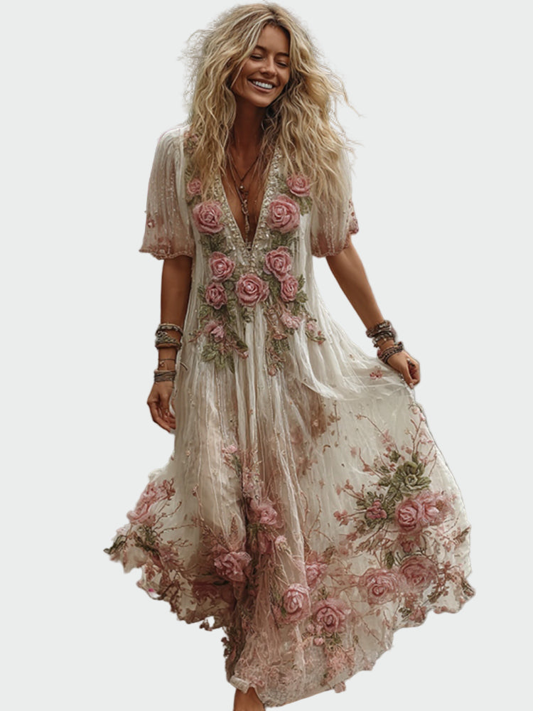 Lyra | Romantické Maxi Šaty S Květinovou Výšivou Boho Vzor